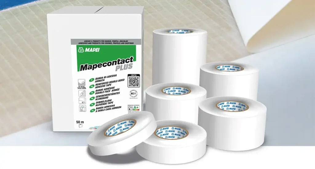 A Mapei bevezette a Mapecontact Plus-t – egy új, oldószermentes, kétoldalas, megerősített ragasztószalagot a kiegészítők, rugalmas és textil padlóburkolatok gyors telepítéséhez. Az új Mapecontact