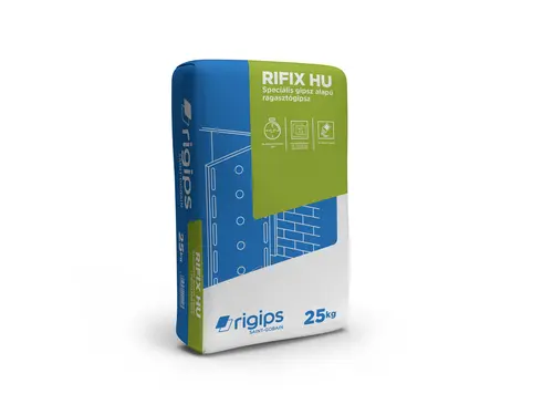 Új, Magyarországon gyártott ragasztógipsz a Rigips gipszkartonlapok falra történő, szárazvakolásos rögzítéséhez.